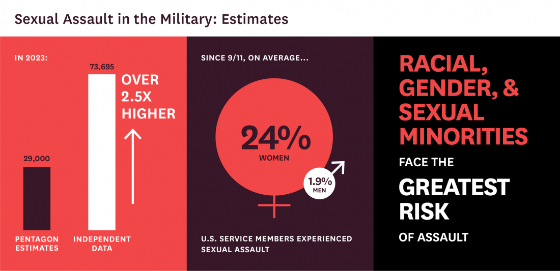 This author of this report found that sexual assault prevalence in the military is likely two to four times higher than official government estimations. Based on a comparison of available data collected by the U.S. Department of Defense to independent data, the research estimates there were 75,569 cases of sexual assault in 2021 and 73,695 cases in 2023. On average, over the course of the war in Afghanistan, 24 percent of active-duty women and 1.9 percent of active-duty men experienced sexual assault. The report highlights how experiences of gender inequality are most pronounced for women of color, who experience intersecting forms of racism and sexism and are one of the fastest-growing populations within the military. Independent data also confirm queer and trans service members’ disproportionately greater risk for sexual assault.